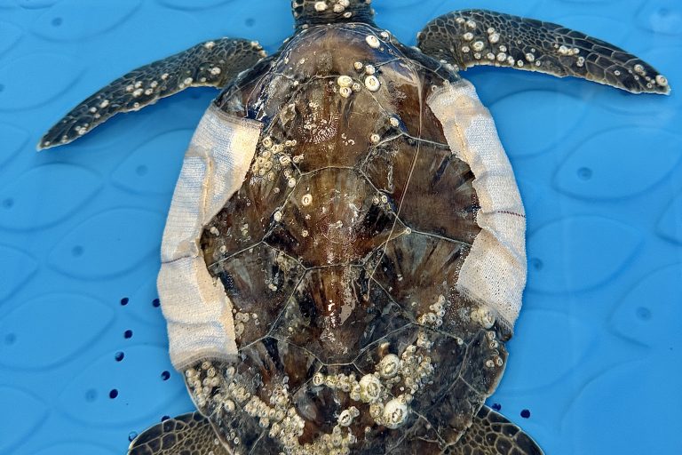 Magnolia is a large, juvenile green sea turtle who was found floating near New Port Richey in Pasco county on Nov. 12th. Magnolia has healed injuries to their caudal carapace and rear flippers from a previous traumatic event. Magnolia is otherwise in a good body condition and active. We will be performing diagnostics over the next few days to help determine the cause of their buoyancy issues.