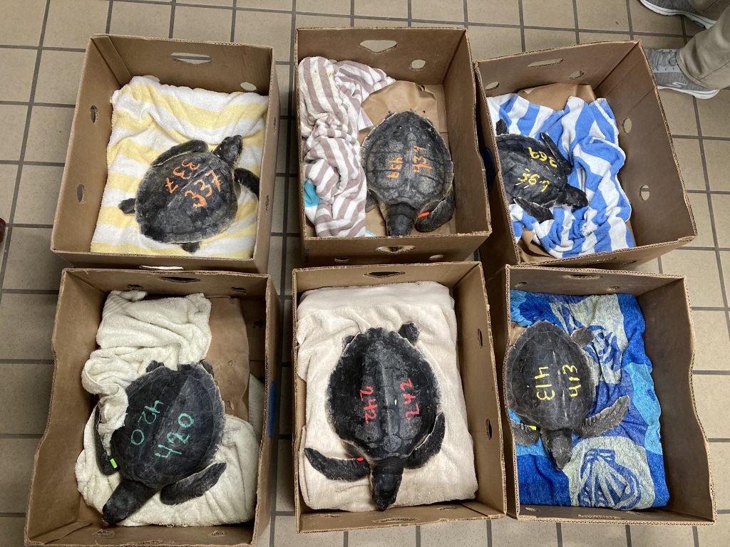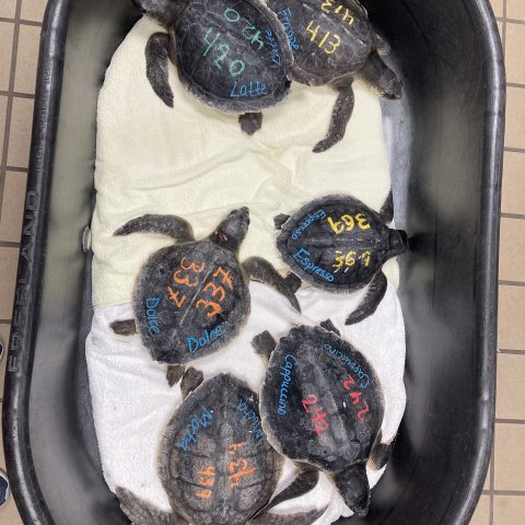 On December 22nd, Clearwater Marine Aquarium received 6 juvenile Kemp’s ridleys transfers from New England Aquarium. These turtles were part of a recent mass cold-stun event in Cape Cod Massachusetts. These facilities treat hundreds of sea turtles every year due to cold-stunning. When their facilities reach max capacity, they transfer out their patients to other sea turtle hospitals to make room for new intakes. Sea turtles can experience cold-stunning when water temperatures drop below 50 degrees F. This can lead to decrease circulation, lethargy, hypothermia, and pneumonia. They will finish out the remainder of their rehab at CMA.