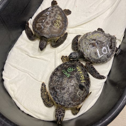 Clearwater Marine Aquarium received 12 juvenile, green sea turtles from Volusia Marine Science Center due to their space limitations from a large stranding event. Blarney, Dublin, Guinness, Leprechaun, Paddy and Shamrock were transferred on March 17th (St. Patricks Day). Beaivi, Hare Ke, Idun, Ostara, Persephone, and Shinto were transferred on March 22nd. Blarney and Beaivi both have been in rehab longer at VMSC and have progressed more than the others. Majority of these greens are lethargic and have thin body conditions. Their initial treatment plan consists of antibiotics and fluid therapy. All will remain at CMA to continue out the remainder of their rehab.