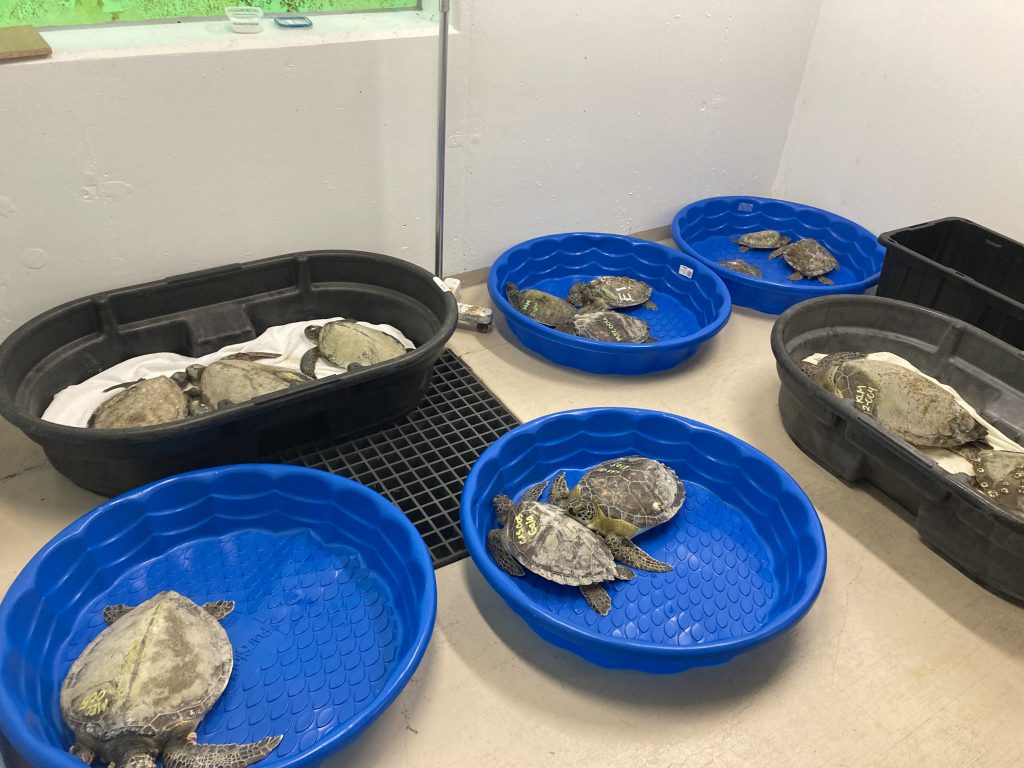 There was a local cold snap event where CMA received over 30 sea turtles in the span of a week. 15 of these turtles recovered quickly and were released on 2/10/26! The remaining had other signs of disease in addition to being cold-stun.
