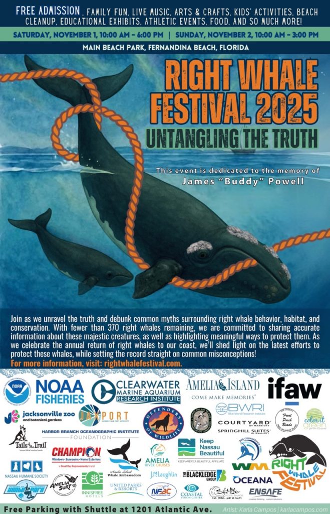 The Right Whale Festival is presented by NOAA Fisheries and Clearwater Marine Aquarium, with major support from the Amelia Island Tourist Development Council and the International Fund for Animal Welfare (IFAW). A full list of sponsors and a complete schedule of events can be found at www.RightWhaleFestival.com.