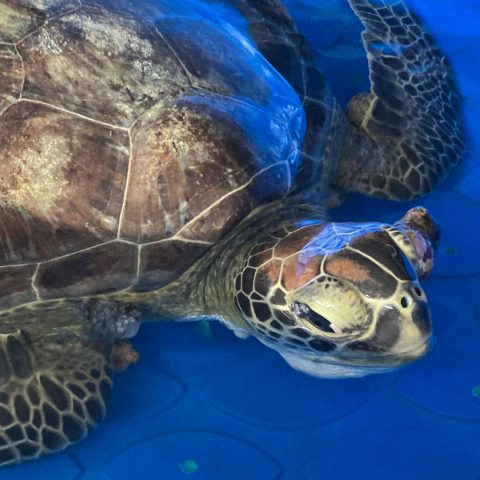 Fig is a juvenile, green sea turtle who was found entangled in fishing line near Hudson, FL on Sept. 21, 2025. The entanglement caused a small ligature injury to their right front flipper. Fig also has fibropapilloma tumors with a large tumor on their left eye that is obstructing their vision. Fig’s initial treatment plan consisted of fluids and vitamin injections.