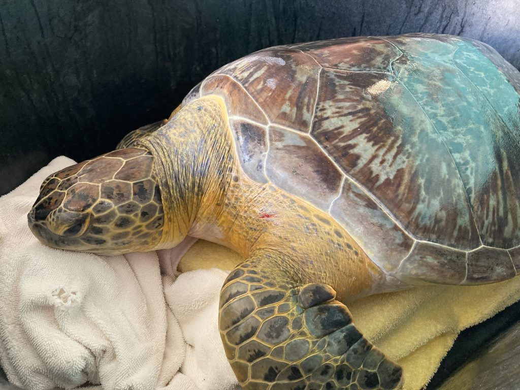 Magnolia is a large, juvenile green sea turtle who was found floating near New Port Richey in Pasco county on Nov. 12, 2025. Magnolia has healed injuries to their caudal carapace and rear flippers from a previous traumatic event. Magnolia is otherwise in a good body condition and active. We will be performing diagnostics over the next few days to help determine the cause of their buoyancy issues.