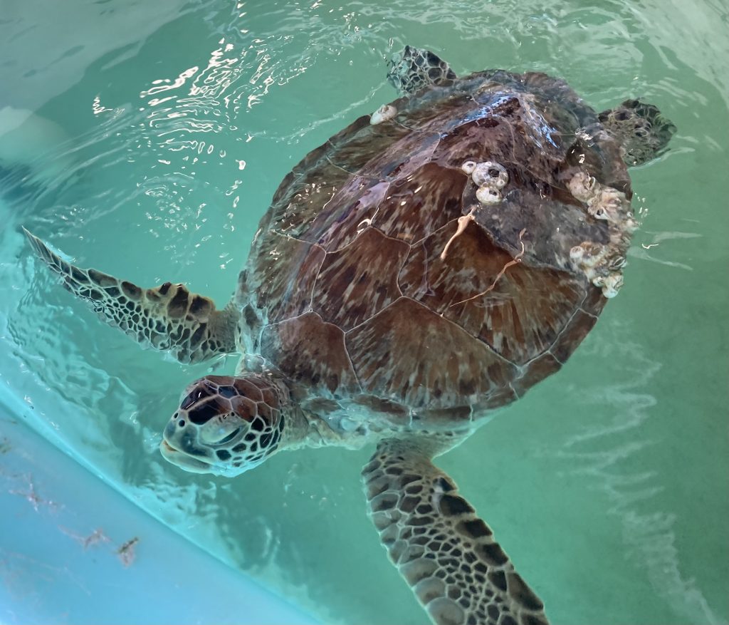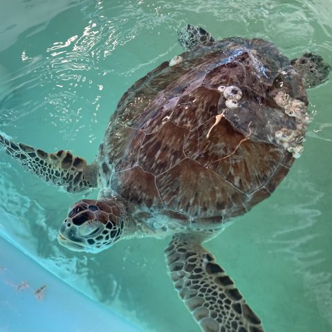 Titan is a juvenile, green sea turtle who was found floating and having difficulty staying submerged near New Port Richey on March 10th. Titan has an old, healed injury to their caudal carapace and has a very, robust body condition. We will be performing diagnostics over the next several days to help determine the cause to their buoyancy.